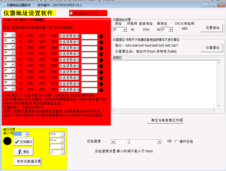 示例:将地址为0x0A的仪器进行复位为地址为0x01